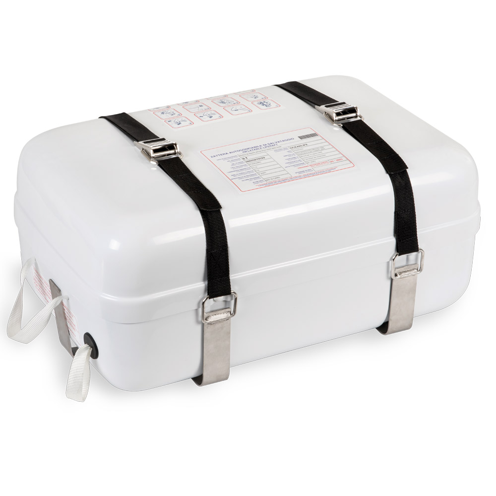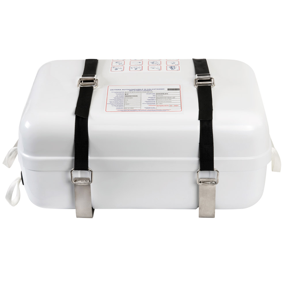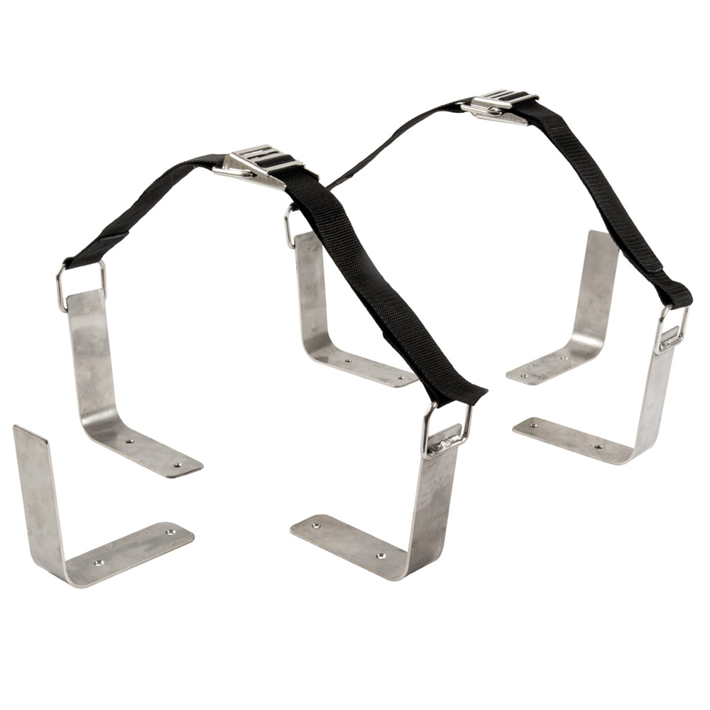 liferaft holder kit complete with L-shaped supports for fixing on deck or bulkhead, self locking buckle with quick release system and heavy poyester straps with high resistance stitching. Also useful for fixing scuba tank.